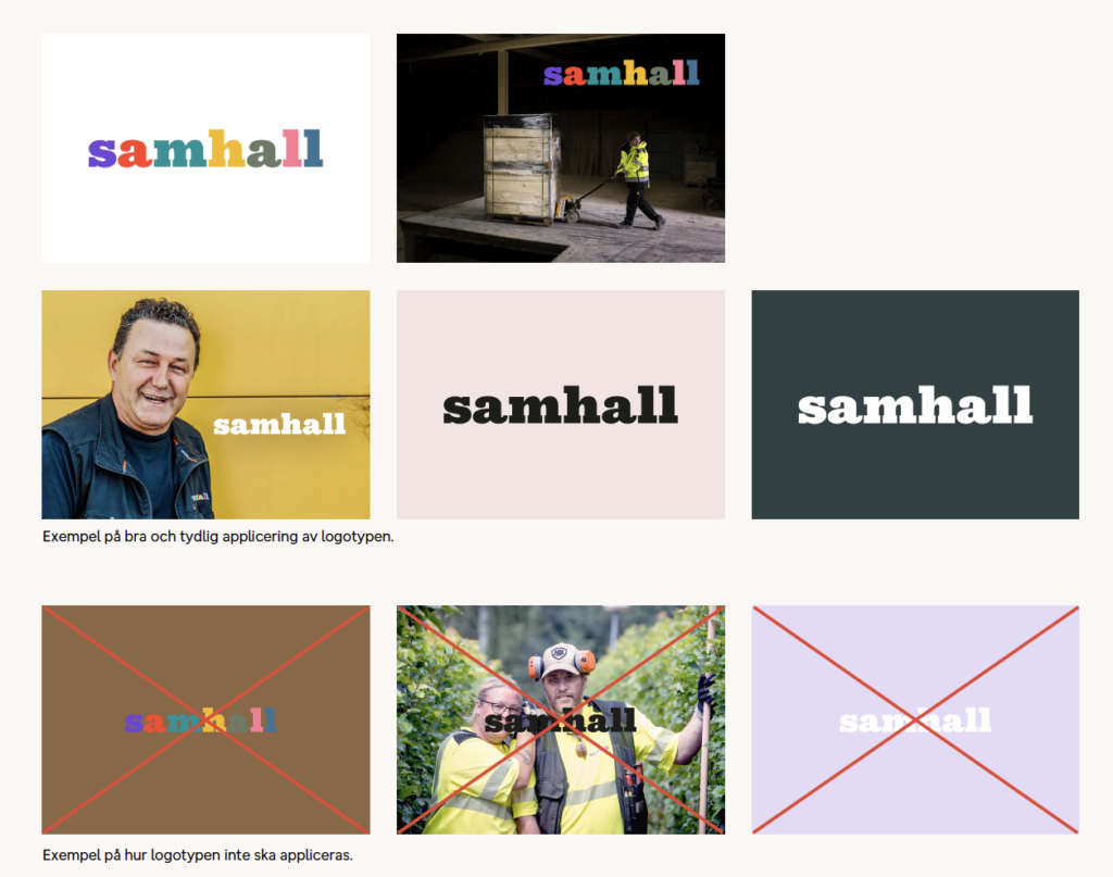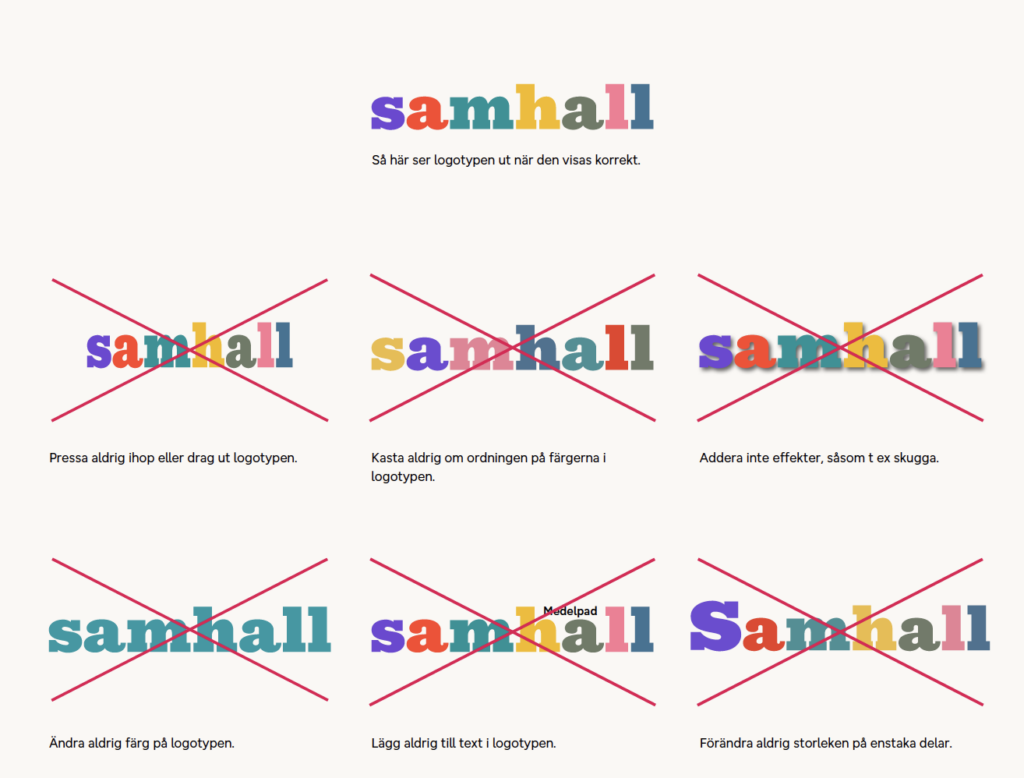 Samhalls logotyp är unik. Den får inte förändras eller manipuleras formmässigt på något sätt. Bredvid visas några exempel på otillåten hantering av logotypen.