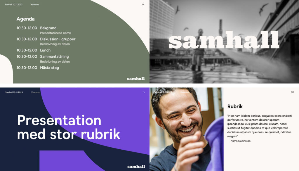 När du startar powerpoint på webben eller i din dator så finns det färdiga mallar och presentationer för dig att använda. Mallarna innehåller färdiga typsidor för olika behov, till exempel text- och bildsidor, inklusive ett färgschema med Samhalls varumärkesfärger. Vi har dessutom gjort ett antal färdiga presentationer som du kan utgå från.
